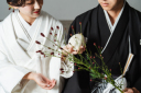 和装ならではの所作の美しさが映える正座カット。綿帽子をまとった新婦さんの清らかな雰囲気を大切に切り取りました。