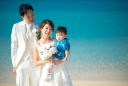 白い砂浜と青い海、波打ち際でを散歩するお2人。手を繋ぎながら。