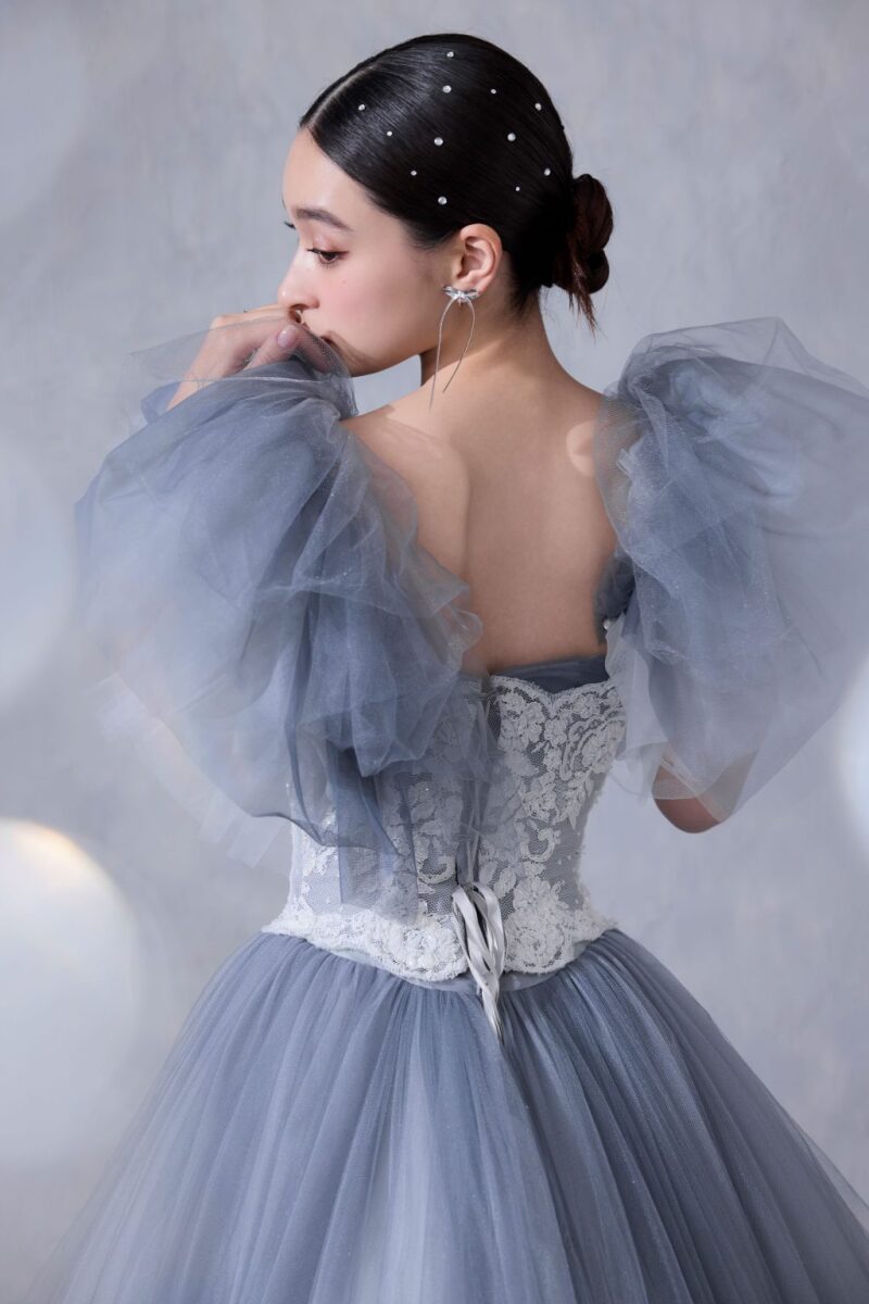 後ろ側に向かって大きく広がったスカートのシルエットや背中側の大きなリボンなど細部まで追求されたデザインで、バックスタイルもお洒落なのがポイントです!