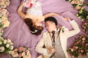 お花に囲まれてお姫様みたいに靴をお婿様に履かせてもらっているシーンとっても素敵ですね。可愛いが好きな方にオススメな背景です。