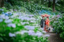 紫陽花が満開に咲く中、番傘を使った和の雰囲気で撮影