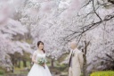 満開の桜のなか、白無垢姿で撮影スタートしました!!