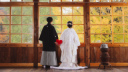 太陽の光で輝く紅葉の下、白無垢と黒紋付袴で撮影スタートです!!