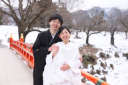 雪で白く染まった日本庭園と、古き良き建物の中に佇むお二人の姿『日本の美』を映し出します。