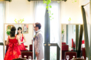 モノトーンな雰囲気の中だからこそお選びいただいた赤いドレスがよく映えます