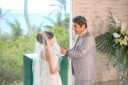 チャペルフォトのあとはオプションのサンセットフォト。ビーチに出る前に、チャペルの大きな窓ガラスを使って、やわらかい光と海のキラキラ感をいれて撮影しました。