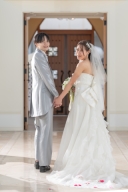 チャペル移動の前にウエディングドレスにチェンジ。雰囲気を変えて、厳かな結婚式のようにチャペルセレモニーフォトを。入場シーンはグリーンのステンドグラスをバックに。