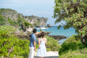 家族3人、まるで天使のようなお子様とビーチをお散歩。手作りのおそろいの花冠が何ともステキ!