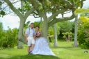 ヤシの木と芝生に囲まれて、沖縄の風を感じるふたりのショットを。