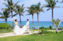 ビーチでは、ウエディングドレスと爽やかなカジュアル衣裳で撮影。笑顔がこぼれるポージングで。