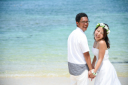 青い空とエメラルドグリーンの海を見つめるふたりを、後ろからおさめます。