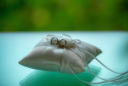 白のお花のヘアピース、ドレスの胸元の小花、ブルーの鮮やかなブーケがリゾートらしさを際立たせるコーディネートに。