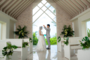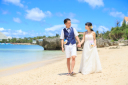 リザンシーパークの自然豊かなビーチで、まずはおふたりだけの撮影。シックなカラードレスが海に映えます。
