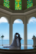 海と緑が見渡せる白いリゾートチャペル。挙式風のシーンで撮影していきます。