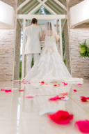 祭壇での新婦様のソロショットは、海をバックにロングベールの繊細な刺繍レースを引き立たせて。