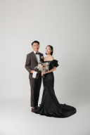 座っている新郎様に、新婦様が優しく手を差し伸べる物語のような構図。広々としたスタジオを活かした、ドラマチックでスタイリッシュなカットです。