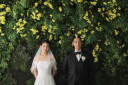 金箔がきらっと光るアレンジ。パフスリーブのドレスが新婦様にとてもよくお似合いです。
