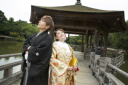 紅葉の時期ピッタリに撮影されたお二人。池の周りにが赤く色づいています。