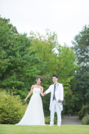 手を取り頭を寄せ合って。自然豊かな緑の中にお二人のお着物もとても映えます!