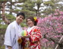 色打掛は兼六園での撮影に。生い茂る苔を入れて、雰囲気ある1枚に。緑に囲まれた赤い打掛がより一層目立っており、背景だけでなく存在感もあるお写真になりました。