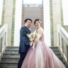 バージンロードで寄り添うお二人。ステンドグラスの光が◎