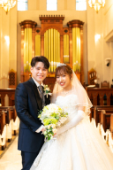 先程とは少し変わってチャペルの外からお撮りしたお写真!ステンドグラスやシャンデリアを背景に☆