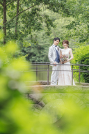 緑を額縁に見立てて、おでこコツン。目は閉じて優しいえみで。