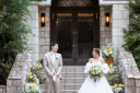 森のチャペルの絵になる外観前でご家族様と一緒に。プライベートガーデンでの撮影も素敵です♪