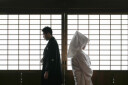北山ル・アンジェ教会の礼拝堂の入場扉は5mの高さを誇ります。優しく差し込む自然光に照らされたおふたりの姿が、大理石のバージンロードに反射します
