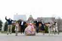 新たな装いで満開の桜の木の前で。卒業式、入学式のイメージがある桜ですが札幌では5月の初めに開花することが多いです。