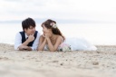 トレーンの長いドレスを選ばれた花嫁様。ゴージャスなシルエットが沖縄のダイナミックなロケーションにマッチしてます。
