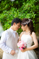 ビーチ前のグリーンをバックに。オールホワイトのお二人とのコントラストがなんとも美しい。