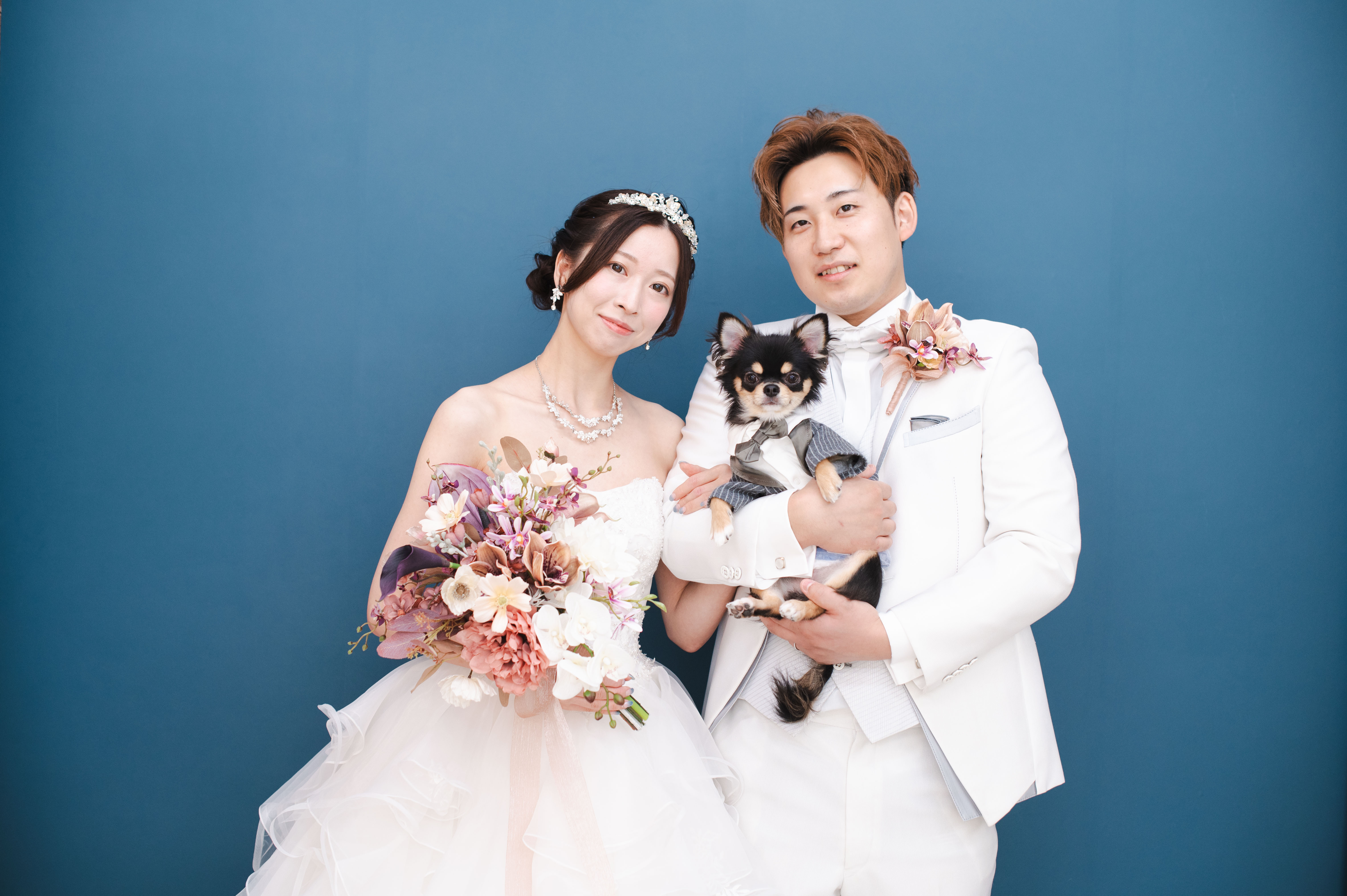 大切なペットと一緒に、幸せな瞬間を写真に残せるフォトウエディング。当店ではスタジオでの撮影も無料で対応。ペット好きなスタッフが可愛いポーズをご提案させていただきます。