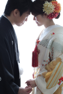 白壁バックに白無垢姿の新婦様。シンプルですがとってもきれいな一枚に!