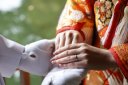 扇子で顔を隠したお二人の姿を撮影しました。夫婦となったお二人の、仲睦まじさとあたたかい空気が感じられる一枚です。