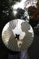 番傘に映るシルエット写真。銀杏の木々から差し込む光で生まれた演出です。