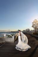 純白のドレス姿にきらびやかな背景で綺麗なポージング、憧れの1枚です。