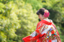 白無垢に紅い番傘が映えますね~美しいです。緑の風景もこれまた素敵