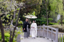 青い番傘で凛々しいお姿の新郎様。風景もとても綺麗で素敵なお写真となりました。