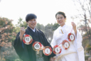 番傘を使用して撮影しました。お二人の爽やかな笑顔が素敵です。