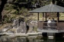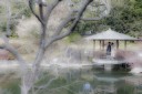 池のある東屋で2人だけの印象的な写真です。この時期ならではのお写真ですね