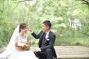 壮大に広がる芝生の上で膝枕ショットの撮影。スコアボードにもお二人のお名前が!一生に一度のフォトウェディング、しっかりこだわりたいですよね!!