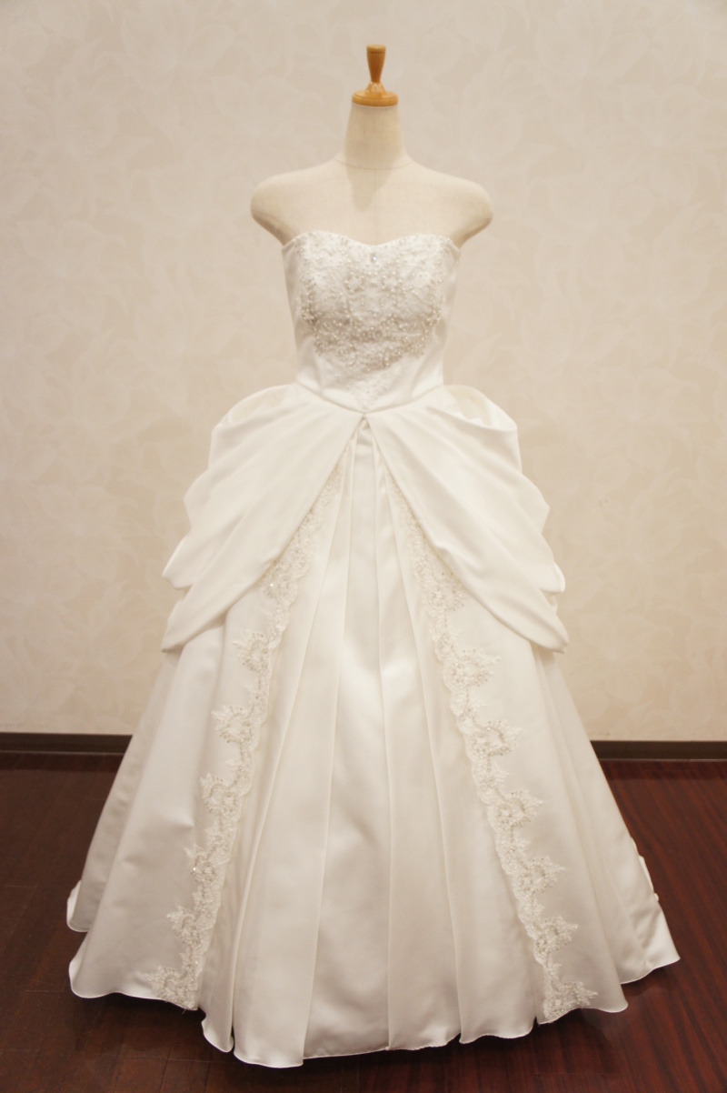 サテン素材に刺繍が施されたプリンセスライン。ハートカットの胸元はデコルテを綺麗に見せてくれる。ウエストにボリュームを持たせ、華やかな印象を与えるデザインは王道のプリンセスドレス。