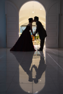 祭壇の前で誓い合うお二人。純白のチャペルをブルーに撮影すると幻想的なショットに。