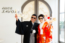 光沢感のあるタキシードと胸元のビジューが華やかなウエディングドレス。今日の日に向けてしっかり打合せ。とってもお似合いです。