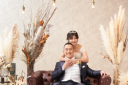 フラワーウォールでは決めすぎず見つめ合いで自然体なお二人を撮影❤