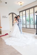 優しくご新婦様を抱き寄せるご新郎様。ご新婦様のはにかんだ笑顔が可愛い1枚。