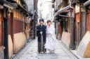 お二人手をつないで見つめ合ったショット!京都の街並みは映えます