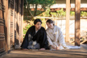お2人仲良く座って撮影。遠くに見える紅葉が日本らしさをプラスします