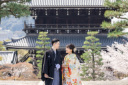 桜満開の祇園。白無垢と黒の紋付袴がステキなお二人です。